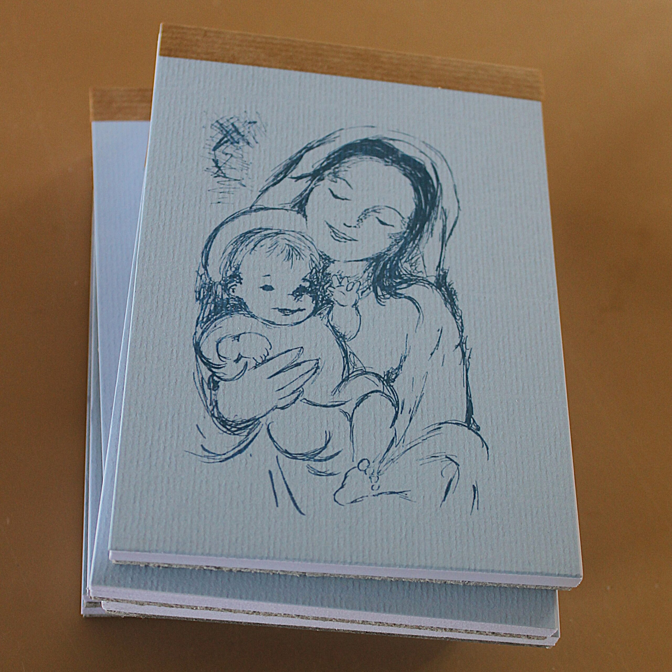 Bloc de 50 hojas encolado sobre cartón duro, con portada de cartulina blanca. Dibujo y diseño de la portada realizados por hermanas de la comunidad. Confeccionado a mano.